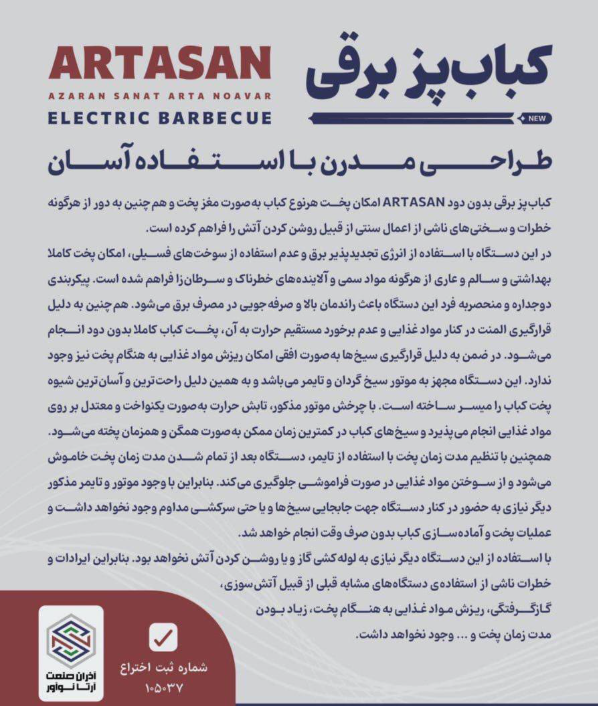 کباب پز آرتاسان دارای نشان استاندارد میباشد. کباب پز آرتاسان دارای یک موتور سیخ گردان خودکار میباشد که سیخ های کباب پز را بصورت کاملا خودکار و بدون دخالت دست میچرخاند.